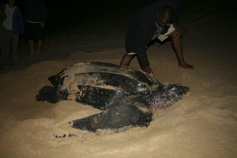 On we went, dark sea and foam on left, white ghost crabs all around us, when we saw a large leatherback just finishing her nest. Ah shucks we said, but it turns out she was just playing with us, making a fake nest to draw off predators, and the real work was just beginning. She chose a site and began painstakingly digging with her back flippers – remember she can’t actually see what she’s doing – it’s all done by instinct and feel – as we piled out the vehicle and made our way stumbling over the dark sand to her. By the way, these ladies are bigger, with elongated, streamlined dark grey or black shells – they average 1.2 to over 2 metres and weigh up to 750kg! Nice turtle, good turtle…